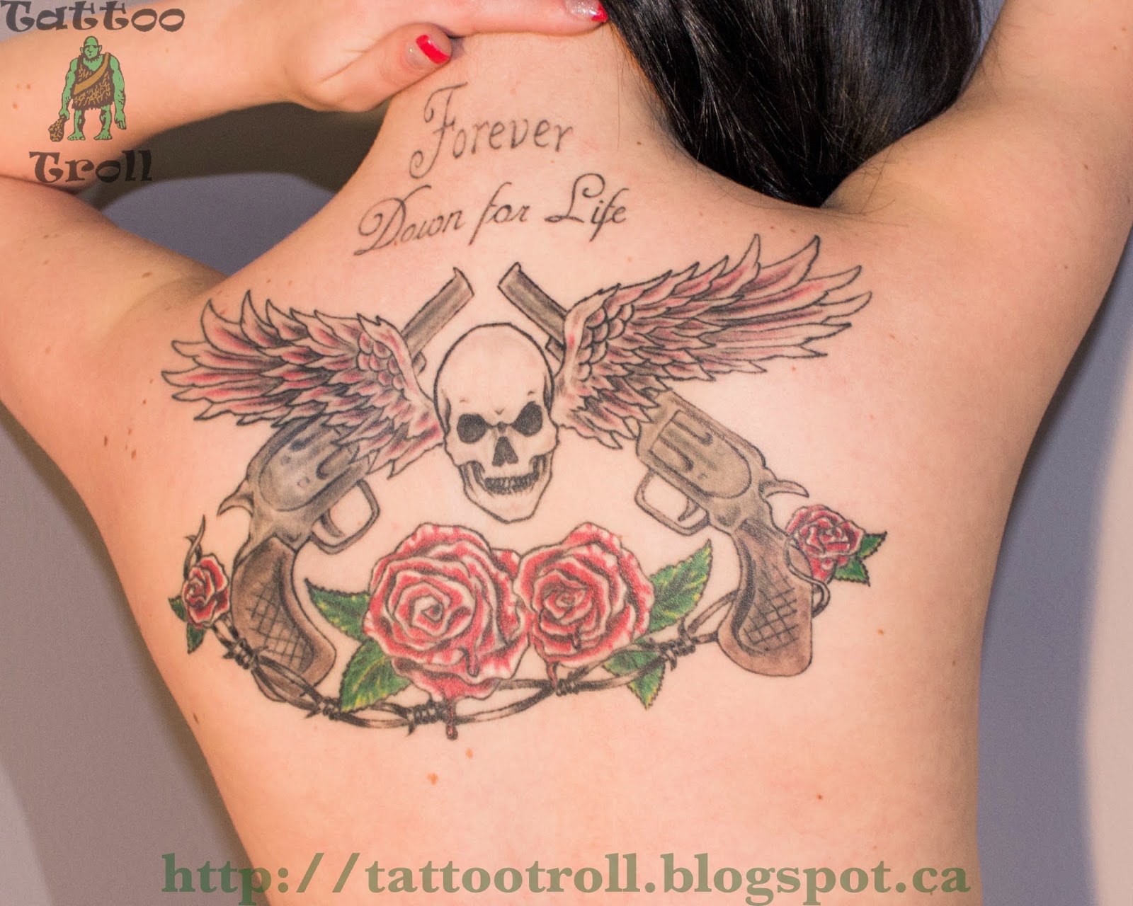 Tattoo Troll presents Harley Angel's wicked back tattoo of guns, a skull, and roses! Come back so for more of this girl.